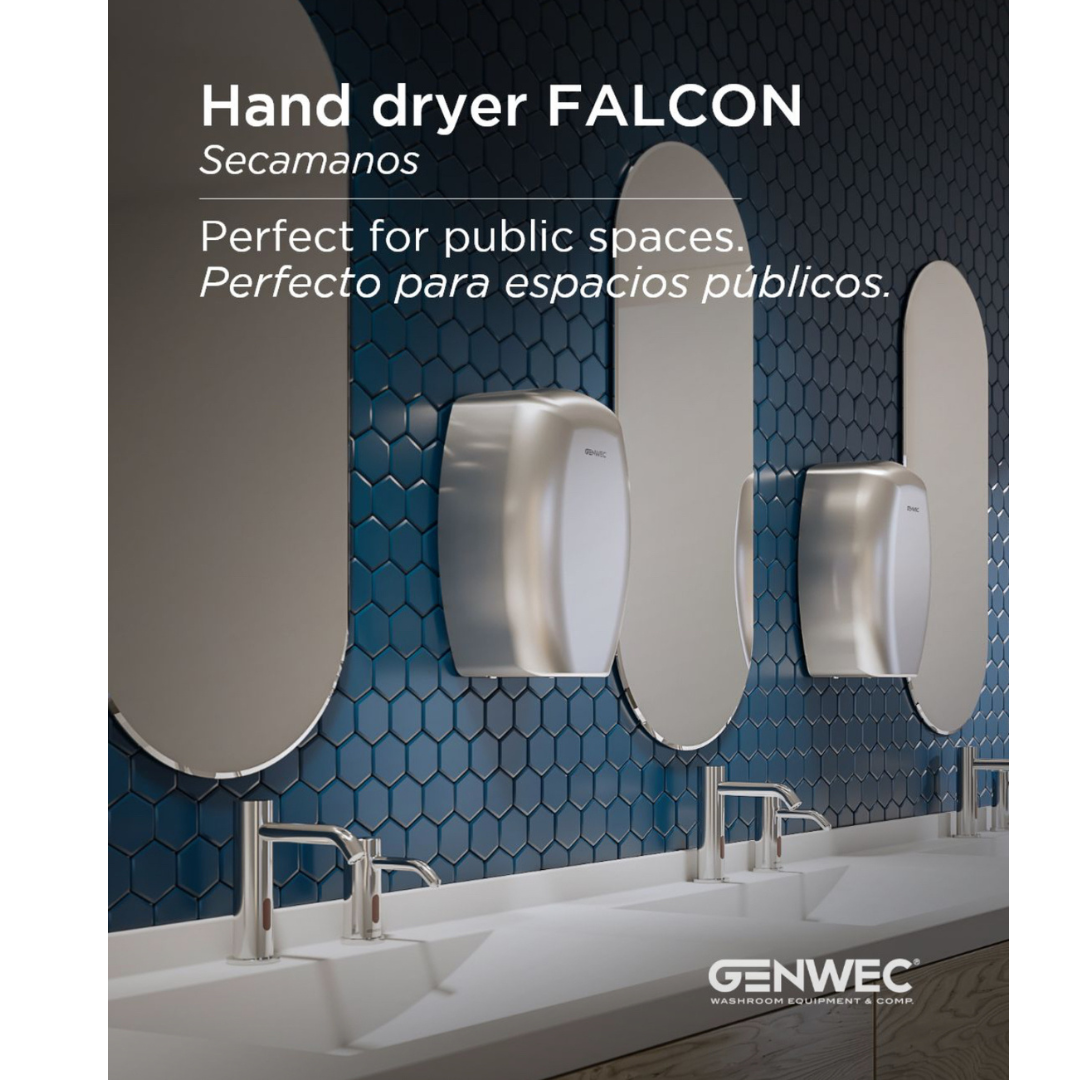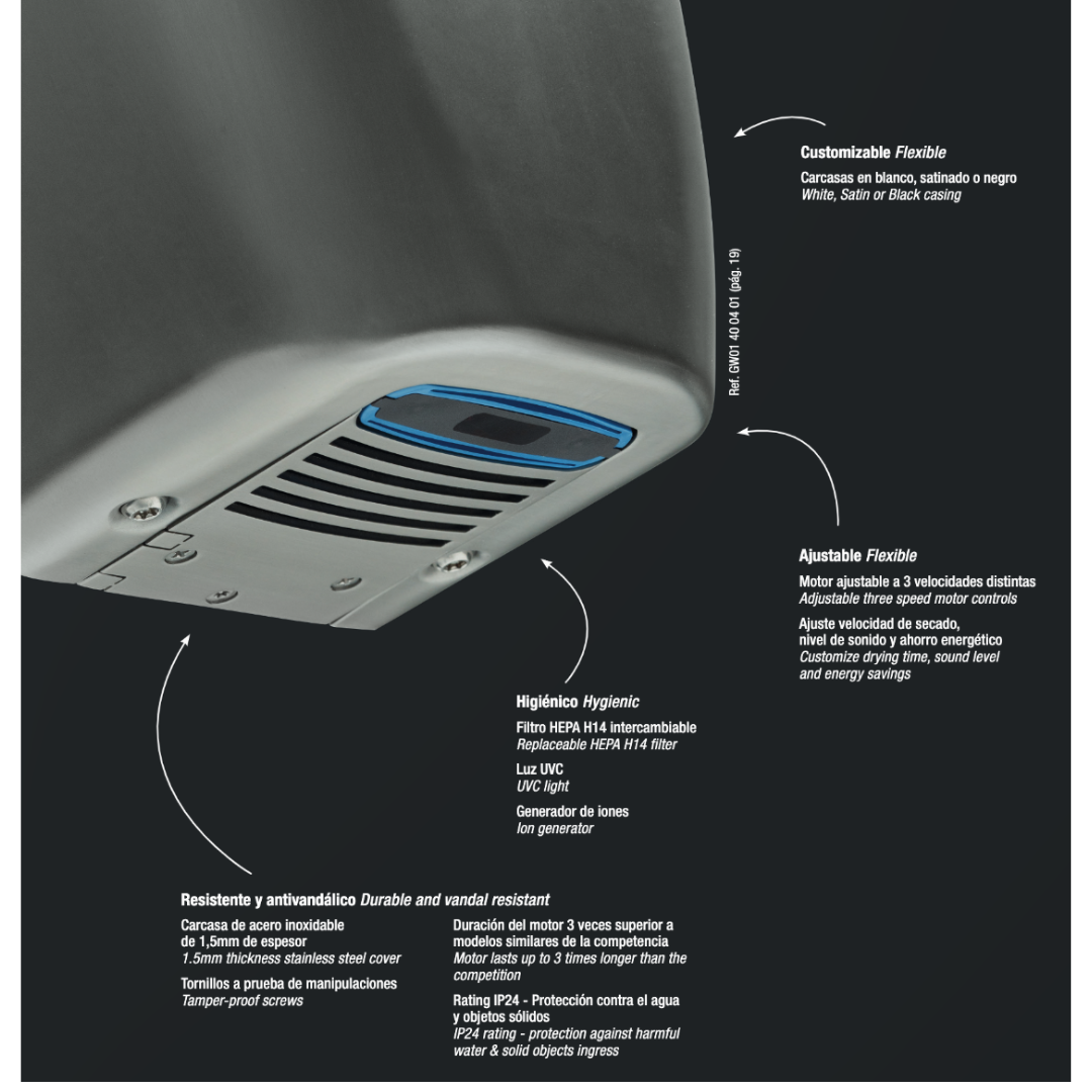 Secador de manos para zonas de alto trafico, el más eficiente y potente. Secado en tan sólo 12 segundos con una potencia total de 900W. Posibilidad de bajar potencia hasta tan sólo 230W.